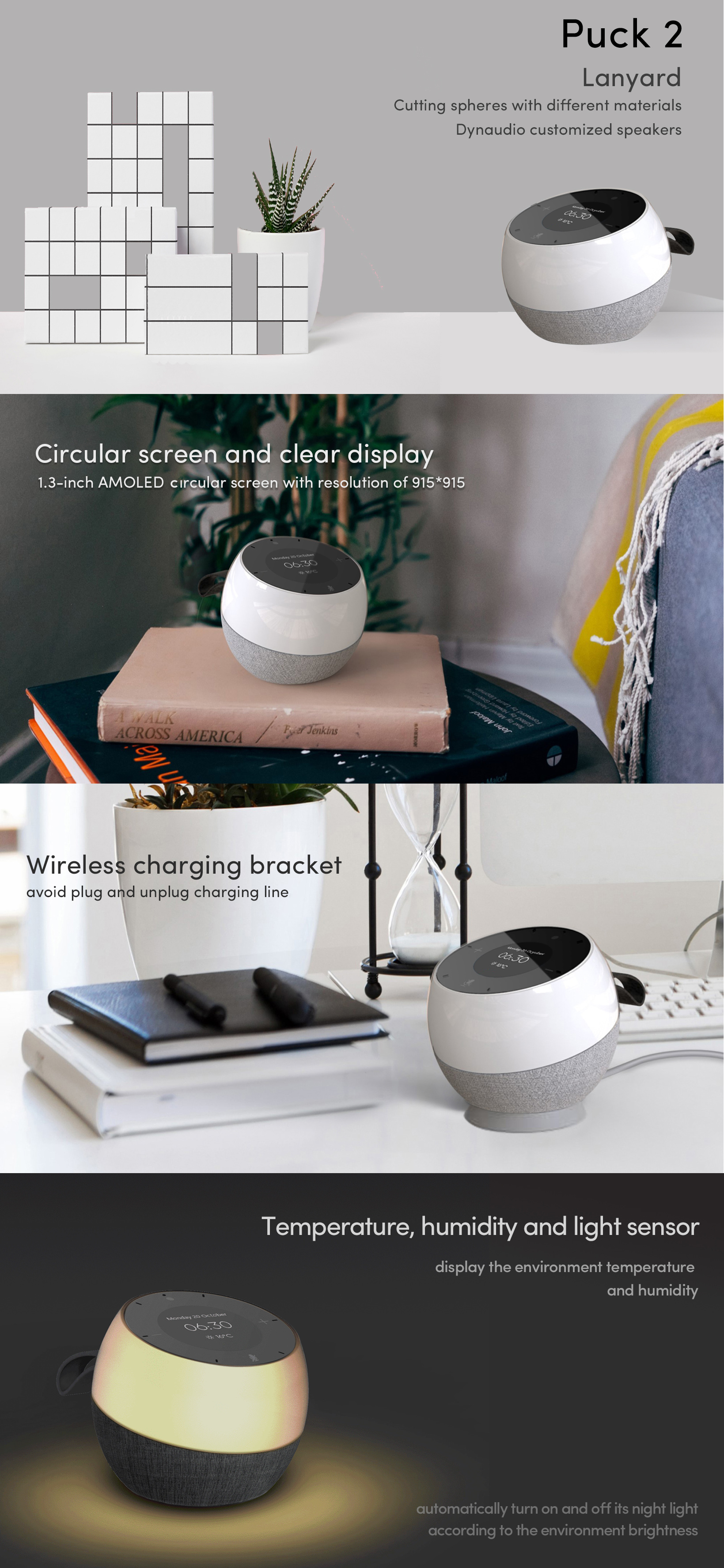 Puck 2 is a portable smart speaker. It has a unique shape similar to an alarm clock and a 1.3-inch circular screen that can display information such as the weather. Support IPX4 waterproof and small night light with voice control.360-degree sound effect and Smart PA can bring a good sense of hearing.